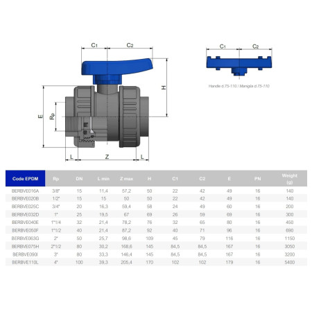 Кульовий кран з внутрішнім двостороннім різьбленням Effast BERBVE з непластифікованого полівінілхлориду PVC-U і з ущільненням з EPDM.