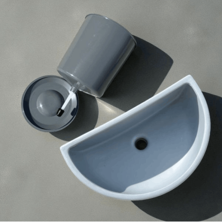 - Рукомийник оснащений містким баком, у який зручно заливати воду для використання під час миття рук.