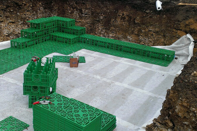 - Великий обсяг накопичення. Завдяки особливій конструкції дренажні блоки забезпечують ефективне накопичення і розподіл води.