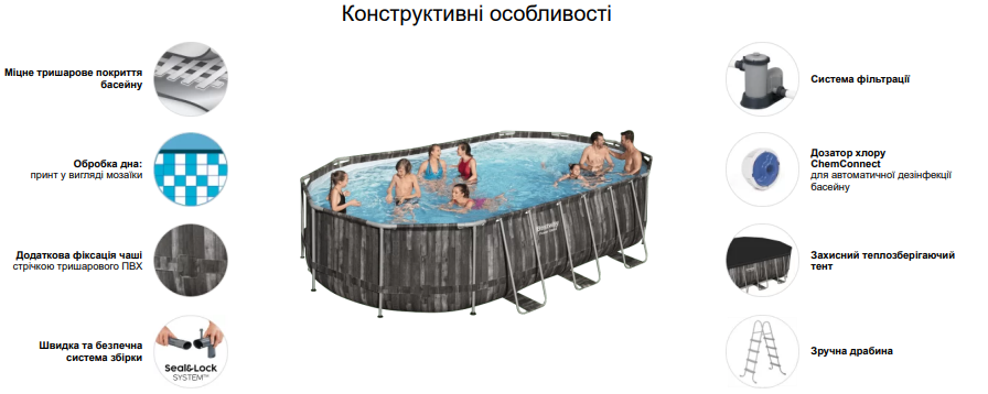 Овальний наземний каркасний басейн Bestway серії Power Steel Wood Style - це відмінний варіант для занять плаванням, водних ігор та відпочинку великою компанією. Чаша басейну має об'єм 20 241 л та габарити 6.1x3.66x1.22 м. Проста збірка без інструментів займає всього 20 хвилин. Надійну фіксацію елементів каркасу забезпечує система Seal&Lock System™. Технологія Framelink™ захищає каркас від іржі. Тришаровий армований лайнер Tritech з обручем з ПВХ, який фіксує чашу, робить конструкцію стійкою та довговічною. Привабливий вигляд басейну надає висока якість друку. Стилізований малюнок блакитної мозаїки на поверхні дна та зовнішній принт з імітацією дерева ідеально доповнюють дизайн літньої тераси. Вода в басейні залишається чистою протягом усього сезону купання завдяки вбудованому дозатору хлору та фільтрувальній установці. Змінний картридж для фільтра, який миється, поставляється в комплекті. Захисний тент допомагає підтримувати чистоту басейну та зберігає тепло води. Драбина з протислизькими сходами робить використання басейну ще комфортнішим. Чаша обладнана дренажним клапаном для зливу води з басейну.