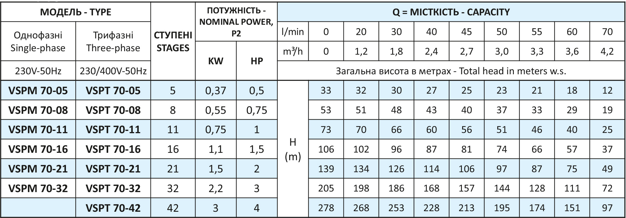 Багатоступінчасті занурювальні 4” насоси Vinar VSPT 70 для глибоких свердловин. Використовуються, головним чином, для подачі чистої води в побутових та промислових цілях, дощових і зрошувальних установках, в системах пожежогасіння для подачі води зі свердловин.