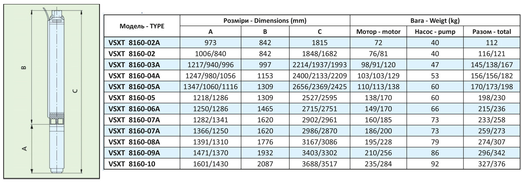 Багатоступінчастий занурювальний 8″ насос Vinar VSX 8160 призначений для роботи у свердловинах, обладнаних свердловою колоною не менше 200-290 мм. В основному використовуються для подачі води у промислових цілях, організації систем центрального водопостачання, в установках для зрошення та пожежогасіння, скрізь, де потрібна подача чистої води із свердловин.