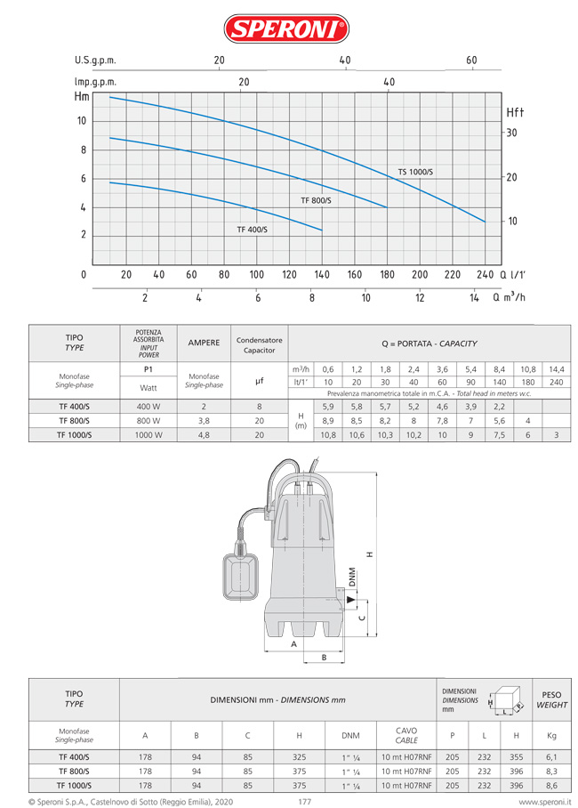 Дронажний насос Speroni TF використовується для відкачування нефільтрованої води з льохів або резервуарів, чистої або злегка забрудненої води, а також для заповнення ємностей при подачі води на велику висоту в самопливних системах зрошення.