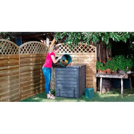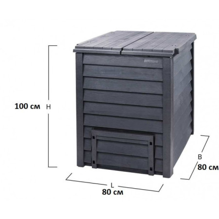 Компостер Thermo-Wood (Термо-Вуд) чудове дизайнерське рішення. Має поверхню імітуючу текстуру дерева, його зручно заповнювати завдяки двом великим верхнім кришкам, а витягувати готовий компост просто через нижнє вікно. Компостер вентилюється через приховані в ребрах жорсткості отвору. Як і всі компостери GRAF, має стійкість до ультрафіолетового випромінювання та до атмосферних змін. Дана модель компостера безперечно впишеться в будь-який дизайн ділянки і стане його чудовою прикрасою.
