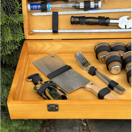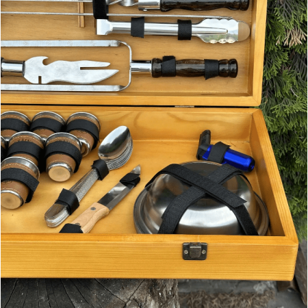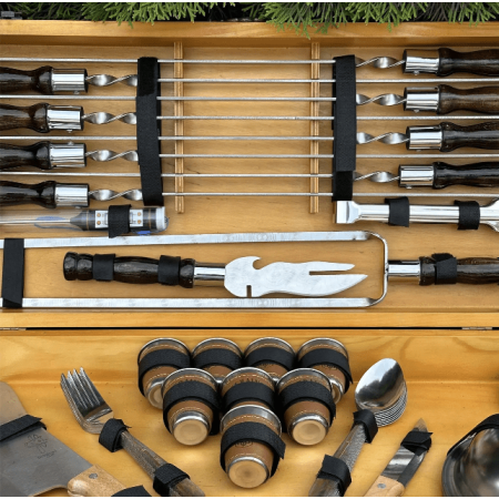 І що може бути краще, ніж набір, який також є витвором мистецтва? Кейс ручної роботи виготовлений з натурального дерева жорстких порід, і тому є не тільки елегантним аксесуаром для зберігання та транспортування, але й додає нотку вишуканості та розкоші у вашій кухні або на пікніку.