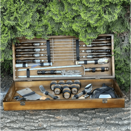 Вражаючий Подарунковий набір шампурів Магнат - ідеальний подарунок для любителів грилю та майстрів кулінарії! Цей набір включає шампура з лезами, виготовленими з високоякісної сертифікованої нержавіючої сталі, що гарантує довговічність, міцність і стійкість до корозії протягом багатьох років. Ручки шампурів виконані з міцного дуба, який має не тільки елегантний вигляд, але й комфортне відчуття в руці. Завдяки своїй природній міцності дерев'яні ручки забезпечують безпеку та зручність при готуванні. І що може бути краще, ніж набір, який також є витвором мистецтва? Кейс ручної роботи виготовлений з натурального дерева жорстких порід, і тому є не тільки елегантним аксесуаром для зберігання та транспортування, але й додає нотку вишуканості та розкоші у вашій кухні або на пікніку. Подарунковий набір шампурів - символ гостинності та радості приготування їжі на відкритому повітрі. Будьте впевнені, що ваш подарунок буде затребуваний та оцінений на будь-якому заході. Не пропустіть можливість порадувати ваших близьких чи друзів цим розкішним подарунком, який поєднує в собі високу якість, елегантність та зручність. Замовте Подарунковий набір шампурів зараз!